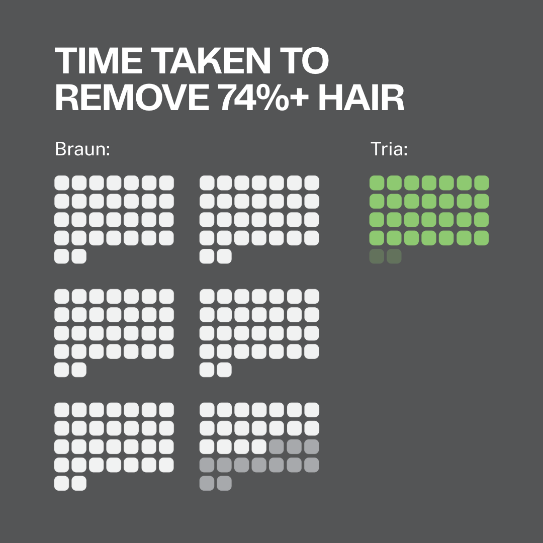 Braun offers up to 74% hair reduction after 12 treatments. Tria offers up to 100% hair removal in just 8 treatments.