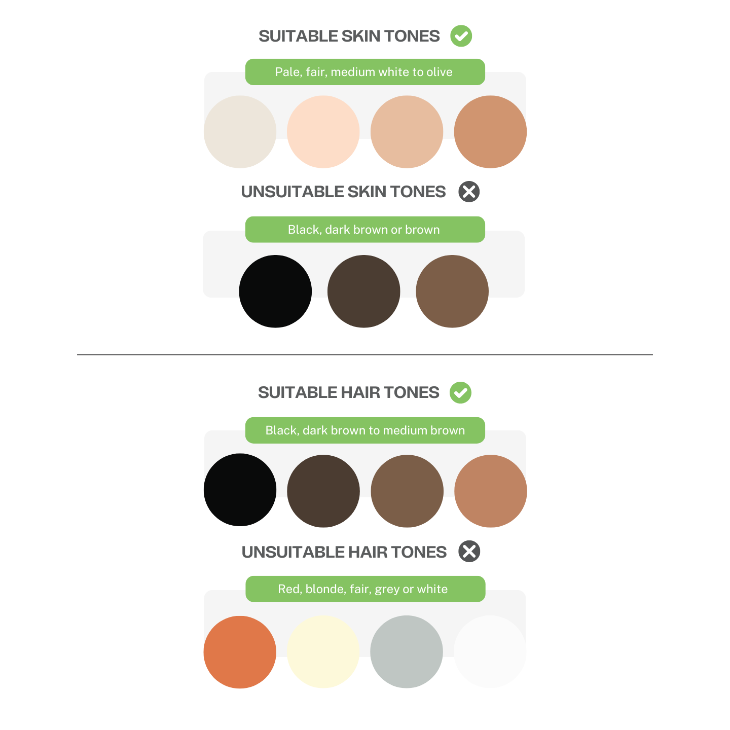 We only recommend using our Tria 4X Hair Removal Laser on skin tones I to IV on the Fitzpatrick Scale and hair tones that are light brown or darker, not blonde, red, grey or white.